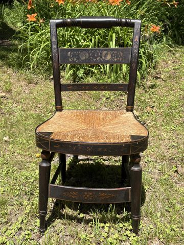 Charming set of early thumb back hand-painted side chairs with rush seats.