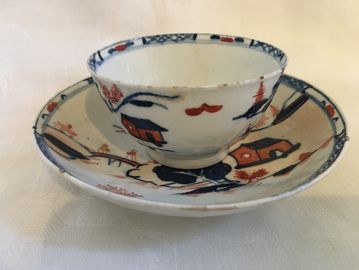 Chinese export porcelain handless teacup and saucer, house pattern. 18th Century